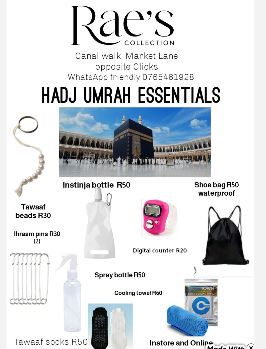 | Colors | Cooling towel, Digital Counter, Foldable water bottle, Ihraam Pins (2), Spray Bottle, Tawaaf beads, Waterproof Shoe bag |